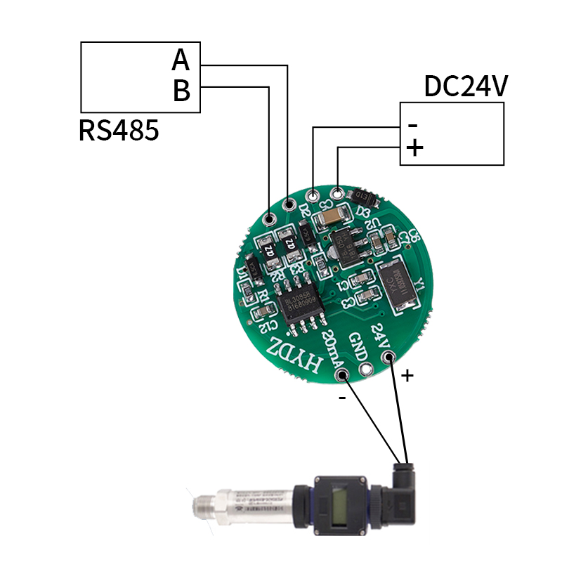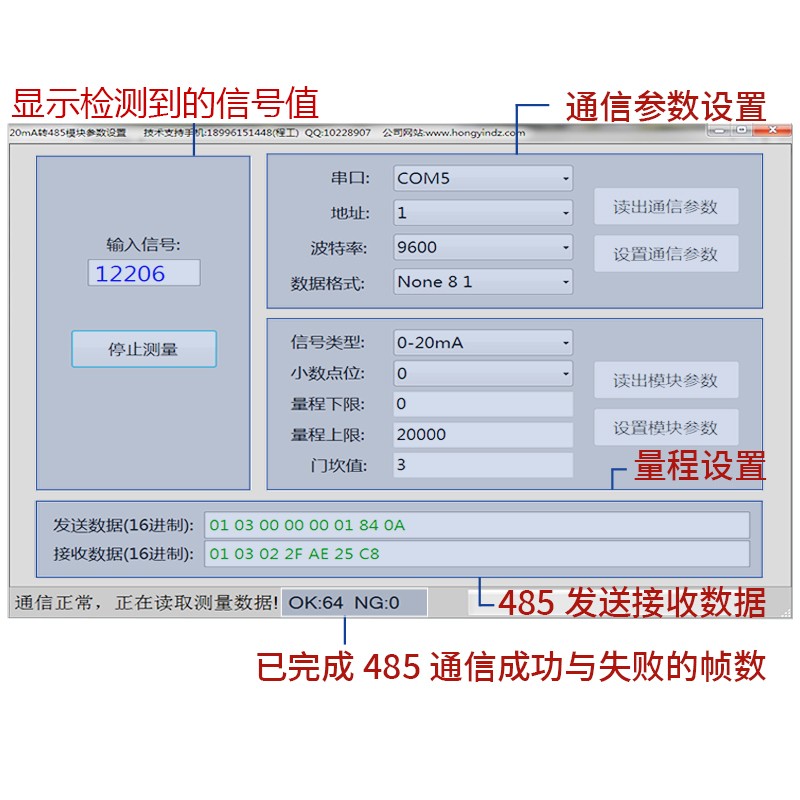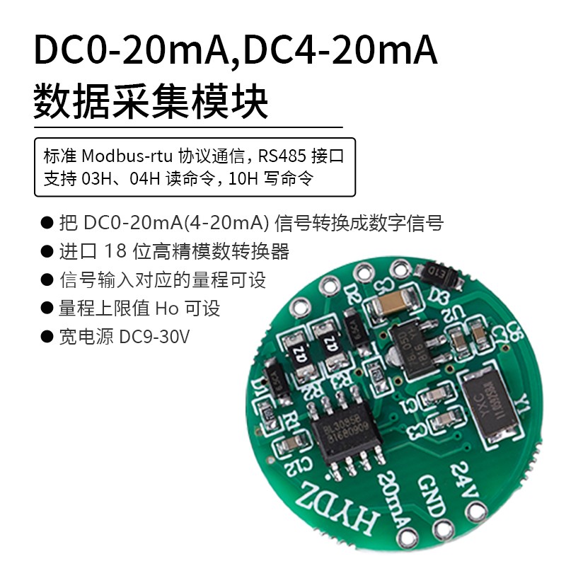 DC0-20mA(DC4-20mA)數據采集模塊,采用進口18位高精模數轉換器把DC0-20mA(4-20mA)信號轉換成數字信號,通過RS485通信接口,標準modbus-rtu協議輸出。通信地址:1~247;波特率:2400、4800、9600、19200、38000、57600、115200;校驗位:無校驗,奇校驗,偶校驗。DC0-20mA(4-20mA)信號輸入對應的量程可設,出廠設置DC0-20mA(4-20mA)對應0-20000。提供參數設置上位機軟件,方便的對輸入信號量程,通信地址,波特率,校驗位進行設置。