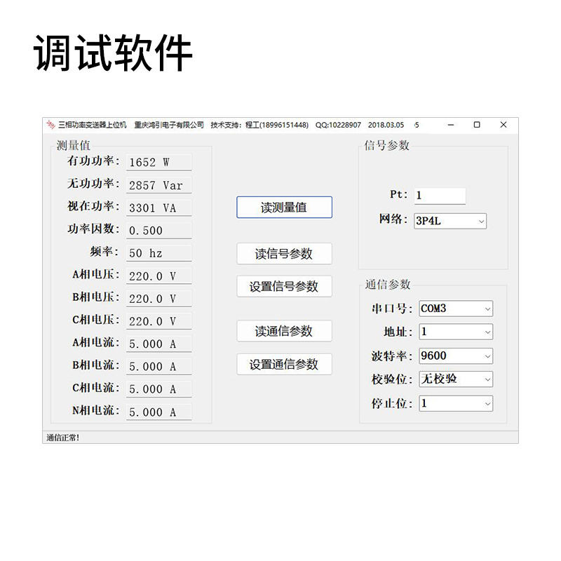 通過上位機調試軟件,可以讀出有功功率,無功功率,視在功率,功率因數,頻率,三相電壓,三相電流等;可以設置電壓電流變比,接線方式,電能脈沖常數;可以設置電壓變送器的通信地址,波特率,數據格式等。