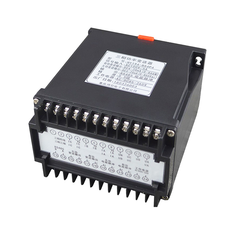 三相功率變送器,通過專用電量芯片采樣,CPU 數字化處理,真有效值算法,高精度的測量有功功率、無功功率、視在功率、功率因數、三相電壓、三相電流、頻率、有功電能、無功電能等,隔離轉換成線性直流標準模擬信號輸出、RS485數字通信接口輸出或電能脈沖輸出。模擬量可選:DC0~20mA、DC4~20mA、DC0~5V、DC0~10V等變送輸出;RS485數字通信接口,采用國際標準Modbus-rtu通訊協議,可與各種PLC、HMI、組態軟件實現組網。最多可選4路模擬量輸出,每路可選對應上面任意一種電參量。有功電能脈沖,無功電能脈沖輸出,脈沖常數300~9999可設。