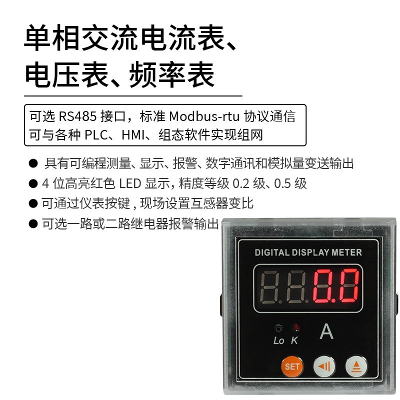 194系列數顯單相交流電流表、電壓表、頻率表,是一種具有可編程測量、顯示、報警、數字通訊和模擬量變送輸出等功能的智能儀表,廣泛應用變電站自動化、配電自動化、智能建筑、自動化生產線、測試臺等。真有效值測量,精度高,穩定性好。互感器變比可通過儀表按鍵現場設置,使用方便靈活。