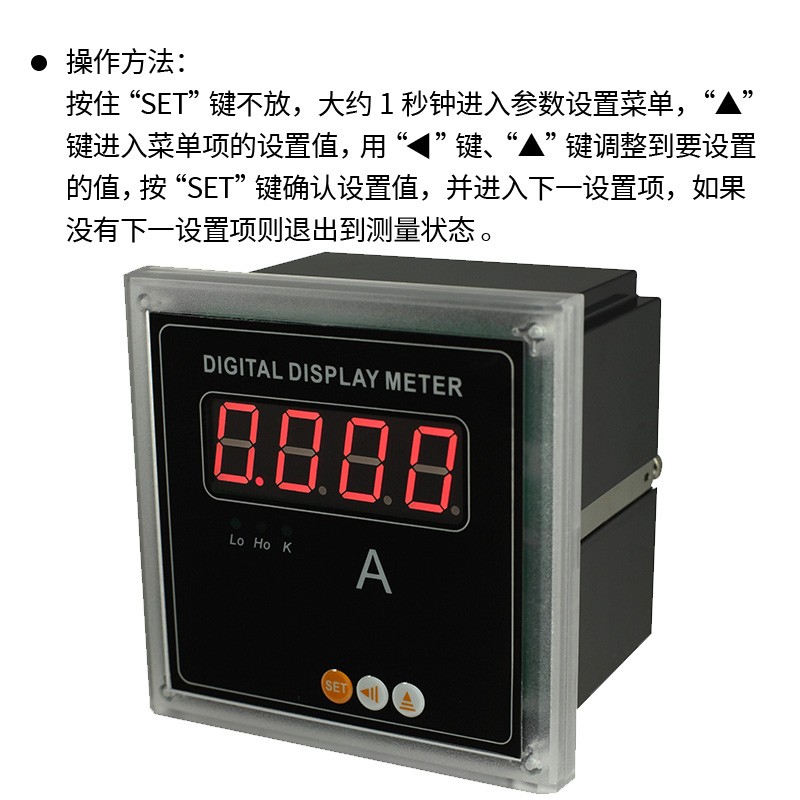 按住“SET”鍵不放,大約1秒鐘進入參數設置菜單,“▲”鍵進入菜單項的設置值,用“?”鍵、“▲”鍵調整到要設置的值,按“SET”鍵確認設置值,并進入下一設置項,如果沒有下一設置項則退出到測量狀態。