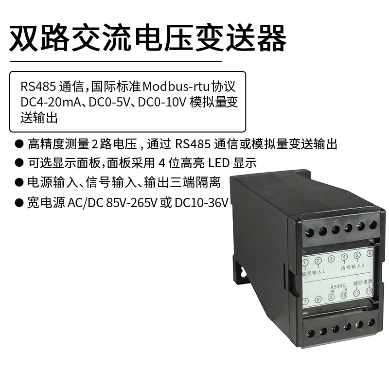 HY194-BS4U2雙路交流電壓變送器,是一種把交流電壓信號隔離轉(zhuǎn)換成線性直流模擬信號輸出或RS485數(shù)字通信接口輸出。模擬量可選:DC0~20mA、DC4~20mA、DC0~5V、DC1~5V、DC0~10V等變送輸出。RS-485數(shù)字通訊接口,采用國際標(biāo)準(zhǔn)MODBUS-RTU通訊協(xié)議,可與各種PLC、HMI、組態(tài)軟件實現(xiàn)組網(wǎng);可選顯示面板,面板采用4位高亮LED 顯示,并帶有3個按鍵用來進(jìn)行參數(shù)設(shè)置。